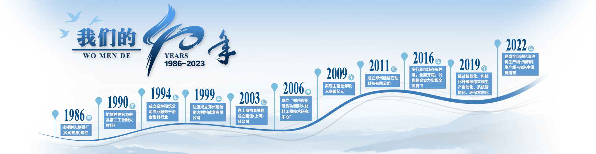 鄭州建信耐火材料成套有限公司總部位于耐材之鄉-河南省新密市,是一家集耐材產品研發、生產、銷售、施工為一體的高新技術企業。公司現有員工350人。鄭州建信耐材下設三個生產分廠,一個專業窯爐砌筑工程公司,構建為全方位的一體化架構體系,為炭素行業,建材行業,鋼鐵行業,有色金屬冶煉行業和環保危廢行業提供涵蓋整套耐火材料設計和生產、現場施工砌筑及后期維護的專業服務。建信耐材先后參與起草國家建材及行業標準:《高鋁抗剝落磚、系列耐堿磚及系列硅莫磚》、《水泥回轉窯協同處置用耐火材料抗侵蝕實驗方法》、《耐火材料及砌筑使用規程》和《石灰窯砌筑技術條件》。近年來先后榮獲“國家科技型企業”、“高新技術企業”、“河南省綠色工廠”、河南省“專精特新”企業、“環??冃級”企業、“河南省著名商標”、“市長質量獎”等殊榮......
